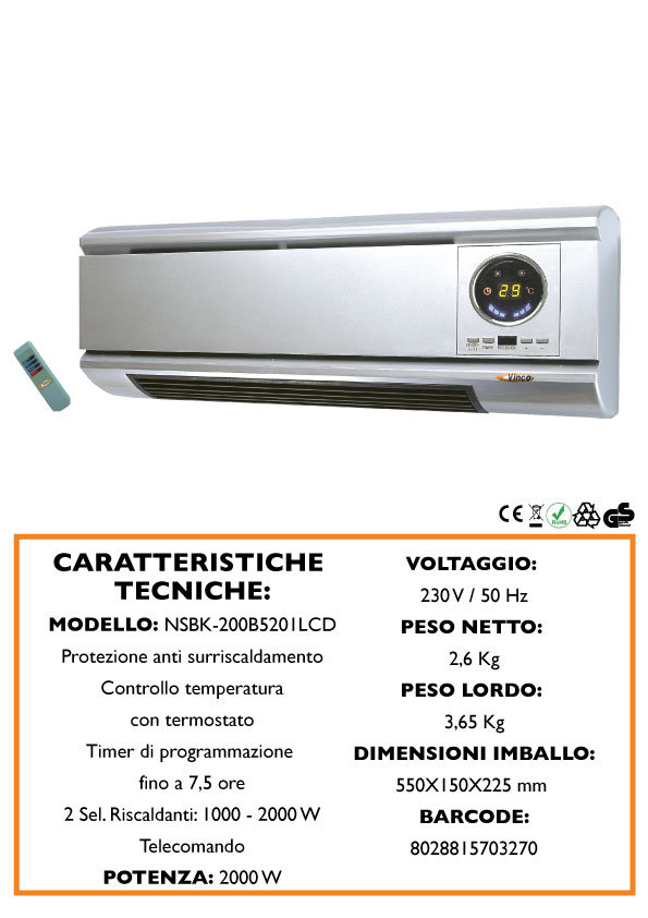 Termoventilatori stufe alogene termoconvettori da parete HobbyStore... grande qualità piccolo prezzoTermoconvettore da parete per riscaldare la tua casa durante l'inverno. Termoconvettore dal design moderno, erogante una potenza massima di 2.000 Watts, dotato di telecomando e timer di programmazione fino a 7,5 ore e controllo della temperatura tramite il termostatoCARATTERISTICHE TECNICHE: