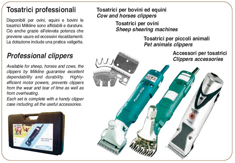 Tosapecore, tosatrici professionali Milkline, tosatrici professionali solo da HobbyStoreDisponibili per ovini, equini e bovini le tosatrici Milkline sono affidabili e durature. Ciò anche grazie all'elevata potenza che previene usure ed eccessivi riscaldamenti. La dotazione include una pratica valigetta.Testata ovini standard in lega di alluminio e zinco. Ghiera svitabile manualmente TOSATRICE MILKLINE PROFESSIONALE !!!CARATTERISTICHE TECNICHE:
