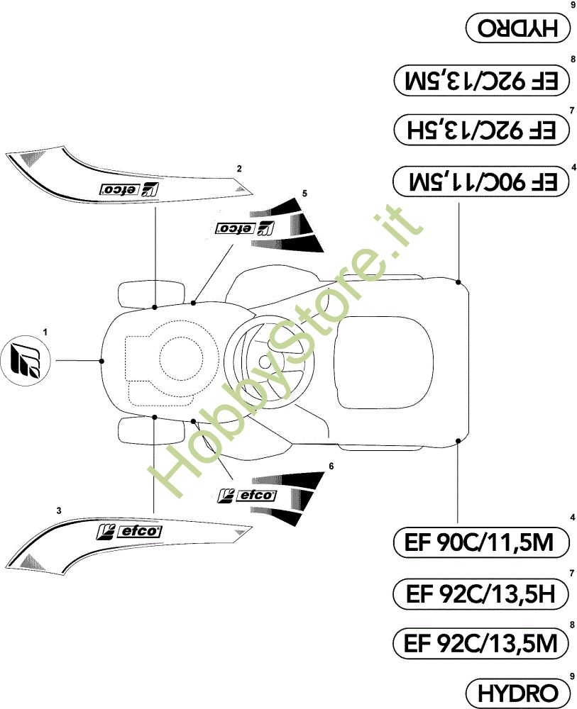 Ricambio Etichetta Etichette (2/2) EF 93C/13,5M Cat.2008 Trattorino della marca Efco Richiede pezzi:1