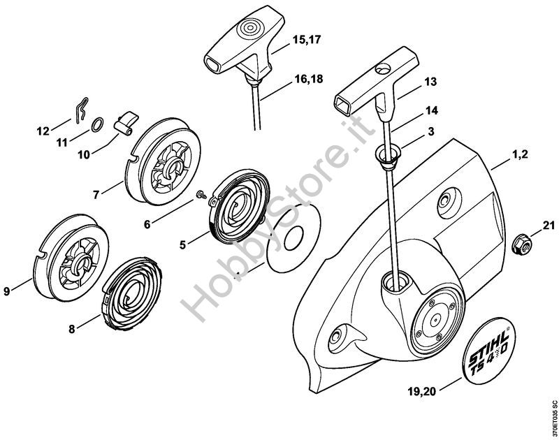 Ricambio Coperchio avviamento con dispositivo di avviamento Troncatrici (TS) TS 420 STIHL Contiene anche i ricambi nr. 1, 3 a 7, 10 a 14, 19, 20